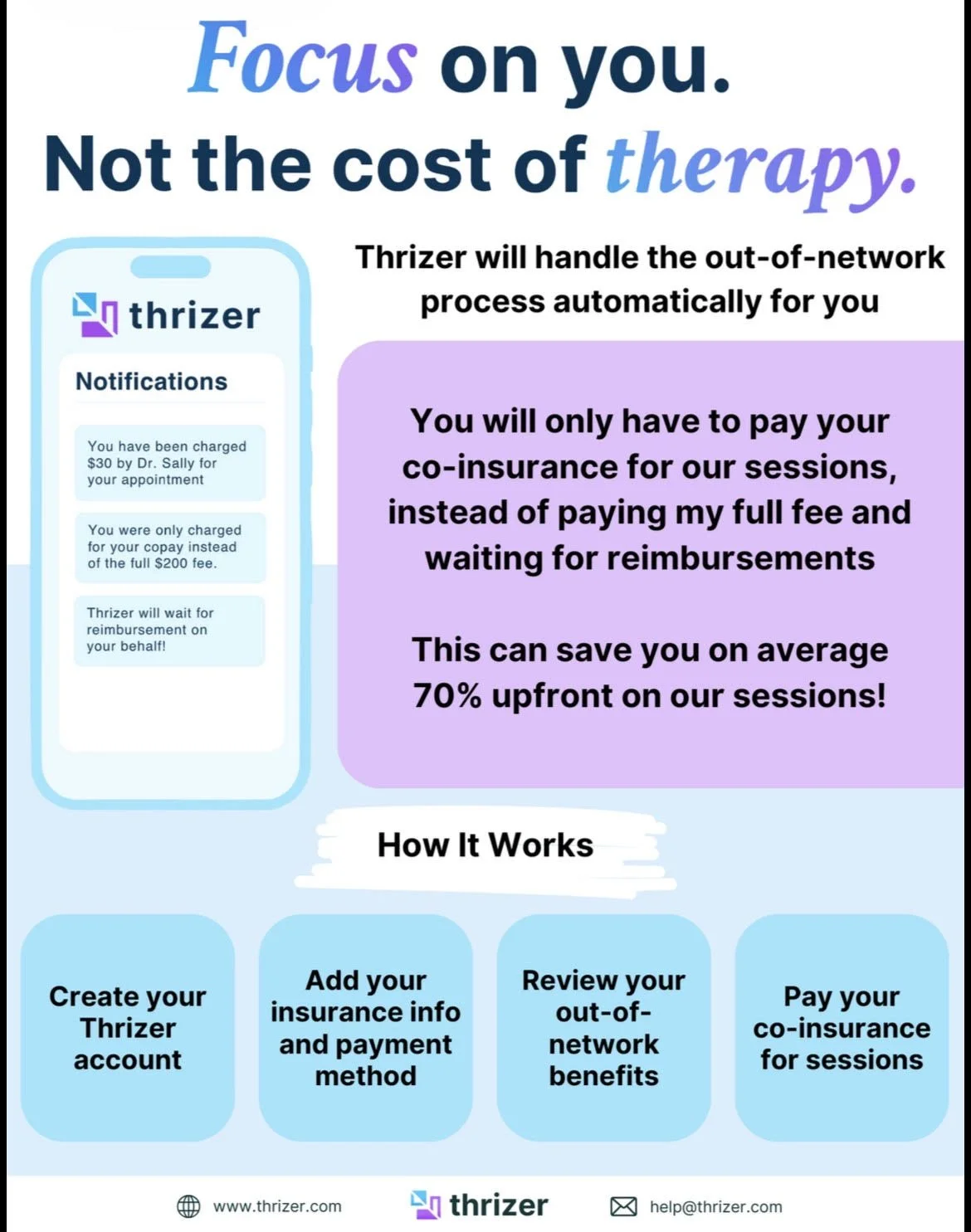 If I am not in-network with your insurance, you may still qualify for help with session costs through your plan. I have partnered with Thrizer to handle the out-of-network process automatically for you. With Thrizer, you only have to pay a co-pay for our sessions once you meet your deductible instead of paying my full fee and waiting for reimbursement. This typically allows clients to save on average 70% on our sessions.